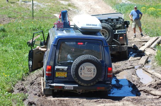 The back country guide described the “road” this way: “passing is extremely difficult on the north side. You may have to back up a considerable distance if you meet another vehicle. There are no hard-core obstacles, but several places are moderately rocky. Do not drive this trail if it is snow covered. Snow sometimes remains on the trail in late July. Be careful crossing deteriorating log bridge at bog. Not recommended for novice drivers or anyone afraid of heights.”
