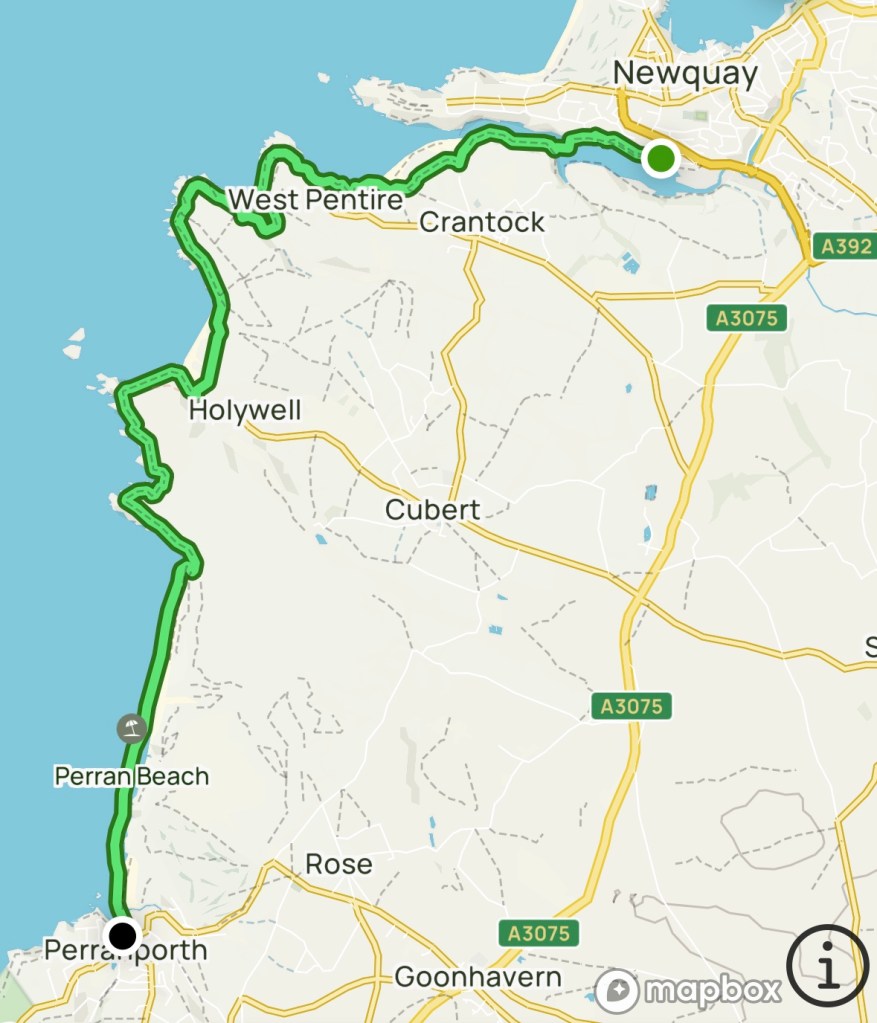 Last night we arrived in Newquay just before dinner time. It is an odd town, full of arcades, punks and surfers. Felt a little rough as we wandered around, and it must have been because Ric doesn’t usually take notice of that sort of thing. However, the coastline here is breathtaking so we got in a quite three miles before we called it an evening.