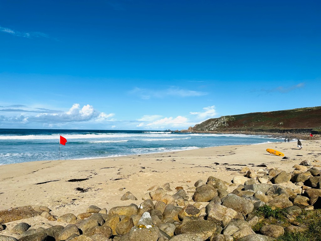 We stopped for long rests at two places. The two most beautiful places along the entire trail: Sennen Cove and Nanjizal Beach.
