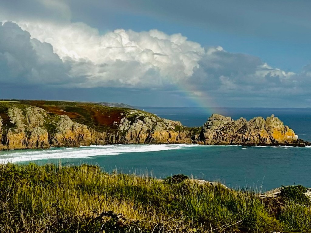 All of that, and there is still this breath taking, astounding section of trail we walked in glorious sun and rain. And the last hill we came up, a rainbow was revealed over Porthcurno Beach, the most beautiful beach in England.